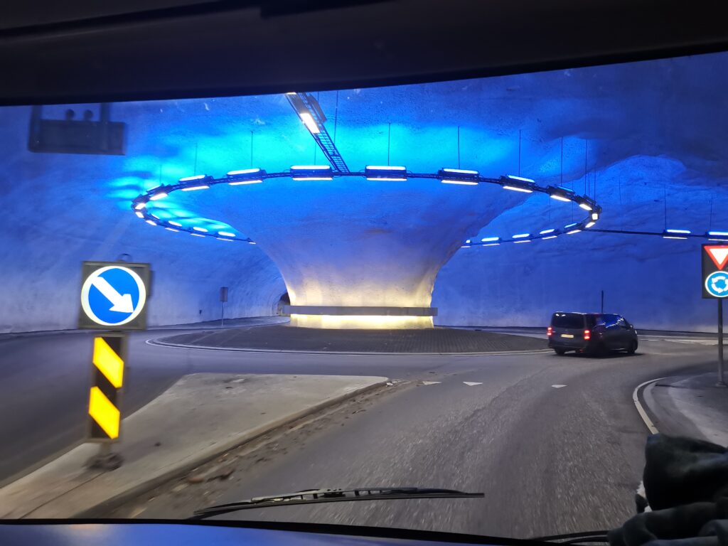 En Norvège, le nombre de tunnels est presque aussi dément que celui des cascades. En roulant 1h à 1h30 par jour, on pouvait en faire une quinzaine. Oui oui, 15 tunnels en une heure, comme ça, sans pression. Des tunnels quelques centaines de mètres… à 8 km ! 8 km de tunnel, c’est humain ça ? Il y avait même des ronds-points à l’intérieur. Oui, j’ai bien dit « des ».